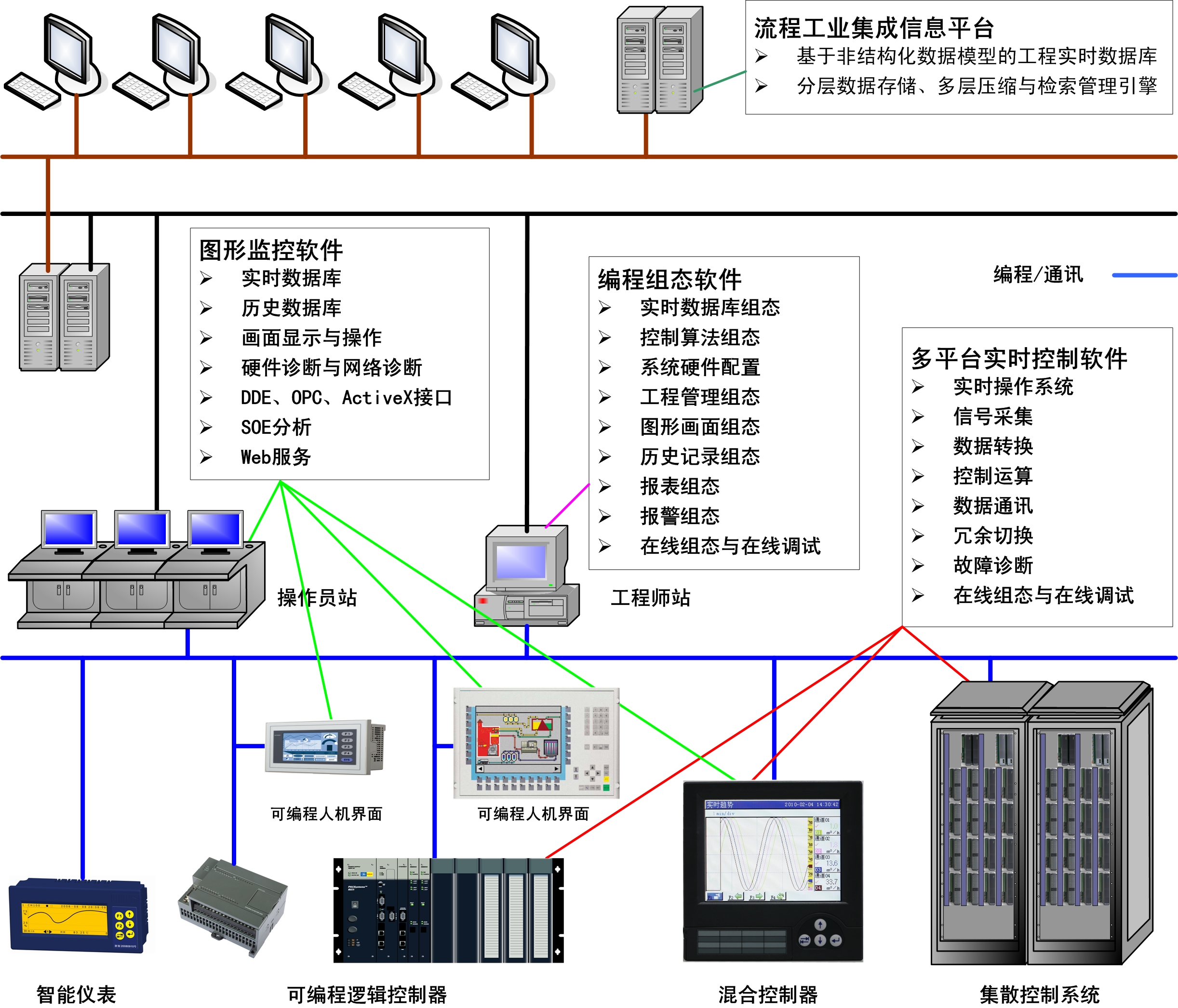 實現Modbus、ProfibusDP等網絡驅動模塊,通過開放規范的OPC客戶端與服務器接口,采用透明網絡管理技術實現與第三方設備的數據通訊,構建分布式工程對象實時數據庫,實現系統數據與外部設備數據的全局一致與統一接口,滿足工業數據多實時性、多語義性、多時空性、多尺度性的信息集成與接口開放要求;