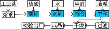 萘系減水劑的生產過程主要由磺化、水解、縮合和中和四個工段組成,如下圖所示: