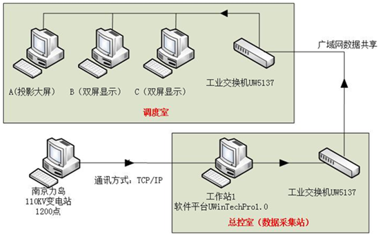 工作站搭載優穩UWinTech軟件,通過TCP/IP協議在軟件上讀取南京力導系統數據,在通過優穩內部廣域網將數據共享至調度室的工程師站。從成本考慮,一臺工作站帶有三個網卡,可以與兩套設備通訊。